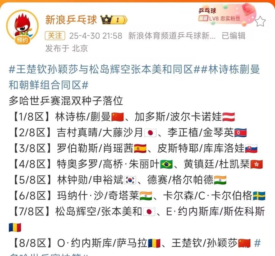 2025多哈世乒赛混双抽签后果落定,王楚钦/孙颖莎与松岛辉空/张本好意思和同处一个1/4区,淌若不出随机,两对组合将演出巅峰对决,这场交锋一定备受堤防。